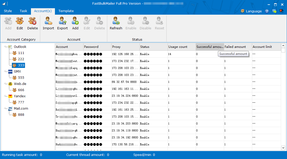 FastBulkMailer is designed for the email marketers who want to send many emails per day, it is a super fast bulk emails sender that can send hundreds of emails per minute. FastBulkMailer can use outlook, GMX, Web.de, Yandex and Mail.com web page inteface to send emails without smtp needed. FastBulkMailer uses socket way(not browser) to send emails, so the speed is super fast and the inbox rate is over 90% with right settings.------------------------------------------------------------------------------------------------------------------------------------------------------------------